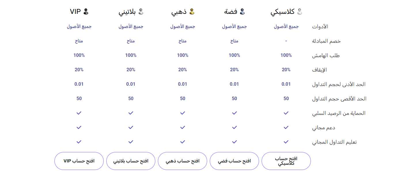 جميع الحسابات توفر رافعة مالية قصوى تصل إلى 1:400، ودعمًا متعدد اللغات، وإمكانية الوصول إلى أكثر من 160 عقد فروقات على الأصول. تختلف فروق الأسعار باختلاف نوع الحساب، حيث تقدم حسابات البلاتينيوم أضيق فروق أسعار تبدأ من 0.03 نقطة. جميع أنواع الحسابات تتبع نموذج تنفيذ بدون غرفة مقاصة (NDD).